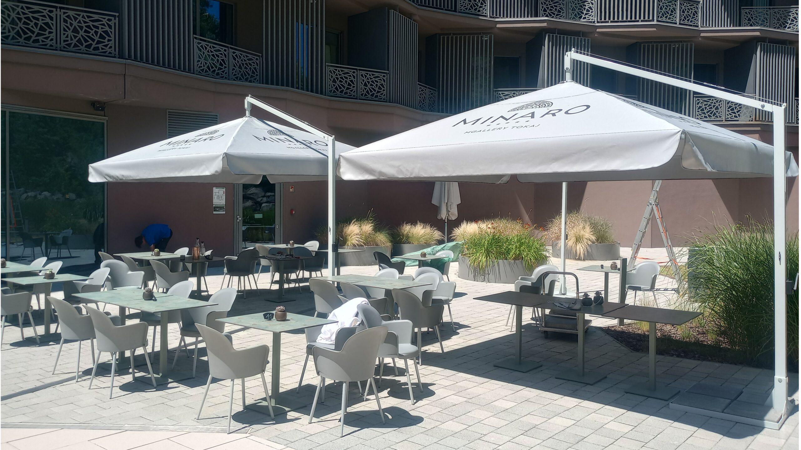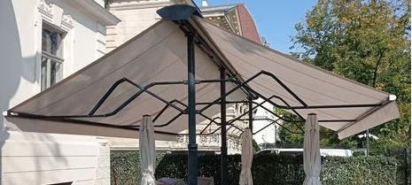 Robosztus szerkezetű napernyő, nagyobb területek lefedésére. Elérhető szögletes vagy kör alakú ernyővel.